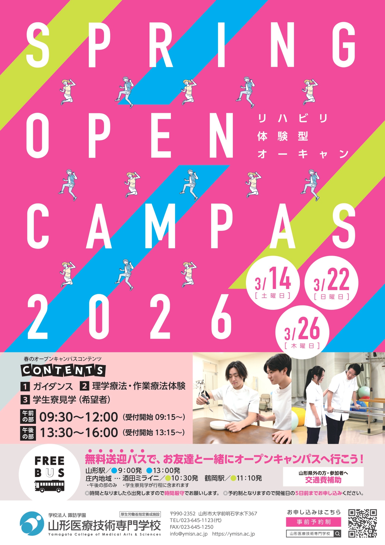| バス送迎 | 山形駅 9:00発 13:00発(山形駅西口前) 酒田駅 10:30発(月のホテル正面口) 鶴岡駅 11:10発(鶴岡駅正面バス専用駐車場) 寒河江SA 12:25〜12:55 学校着 13:15 時間となりましたら出発しますので時間厳守でお願いします。 予約制となりますので開催日の5日前までお申込みください。 庄内方面送迎バスには学生寮の見学が行程に含まれます。 |
